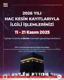 2026 Yılı Hac Kesin Kayıt İşlemleri Yarın Başlıyor 10.11.2025 2026 yılı hac kesin işlemlerinizi, 11 Kasım 2025 Salı günü (Yarın) Saat 09.00'dan itibaren e-Devlet üzerinden yapabilirsiniz. Detay