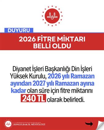 1. Konu ile ilgili hadis-i şerifler, mevcut sosyo-ekonomik hayat şartları ve bir kişinin günlük gıda ihtiyacı göz önünde bulundurularak ülkemizde fitre miktarının 2026 yılı Ramazan ayının başlangıcından 2027 yılı Ramazan ayının başlangıcına kadar olan süre için 240 TL olarak belirlenmesine,