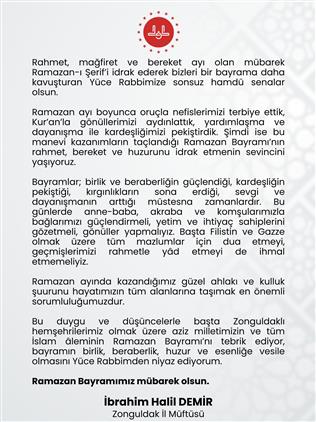 Bu duygu ve düşüncelerle başta Zonguldaklı hemşehrilerimiz olmak üzere aziz milletimizin ve tüm İslam âleminin Ramazan Bayramı’nı tebrik ediyor, bayramın birlik, beraberlik, huzur ve esenliğe vesile olmasını Yüce Rabbimden niyaz ediyorum.