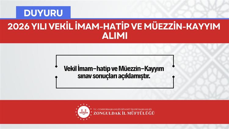 Zonguldak Müftülüğünde 21.04.2026 tarihinde yapılan vekil imam-hatiplik ve müezzin-kayyımlık sınav sonuç listesi ekte olup ilgilere duyurulur.
